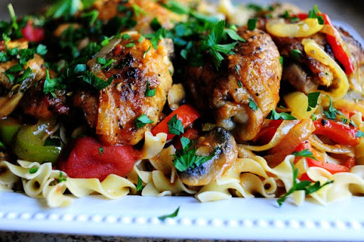 Pour in canned tomatoes and stir to combine. Add chicken back into the pan, skin side up, without totally submerging the chicken. Place lid on the pot and put it into the oven for 45 minutes. Remove lid and increase heat to 375 degrees. Cook for an additional 15 minutes.