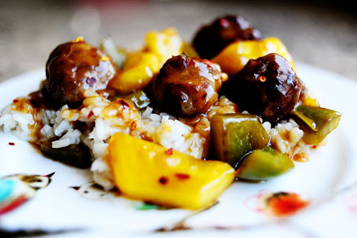 Pour off oil from pan and return pan to medium high heat. When pan is hot, throw in the chopped green peppers and cook for one minute. Add pineapple to pan and cook for one minute, stirring gently. Pour in stock/soy sauce mixture, then add meatballs. Stir gently to combine and allow to cook and bubble for a few minutes, or until sauce is thickened. Add salt and crushed red peppers to taste. (Hint: this dish is yummy if it's a little spicy.)