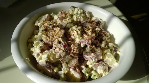 Put Potatoes, egg, green onions, celery, mustard into a large bowl. S&P to taste. Add Mayonnaise and combine. Cover and chill for at least 3 hours before serving.