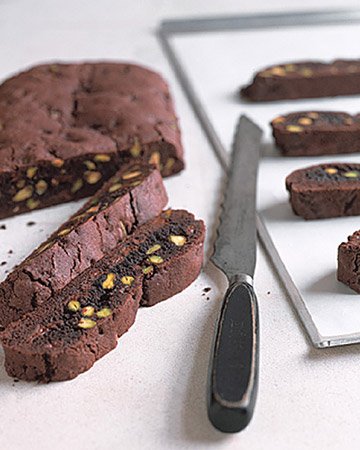On a cutting board, using a sharp serrated knife, cut biscotti diagonally into 1-inch-thick slices. Arrange biscotti, cut sides down, on baking sheet, and bake until crisp but still slightly soft in the center, about 8 minutes.