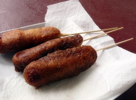 3. Pat the hot dogs dry with paper towels so that the batter will stick. Insert wooden sticks into the ends. Dip the hot dogs in the batter one at a time, shaking off the excess. Deep fry a few at a time in the hot oil until they are as brown as you like them. Drain on paper towels or serve on paper plates.