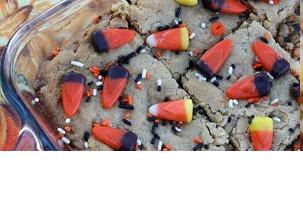 Sprinkle the top with candy corns. Return to oven, watching carefully, for two to three minutes, just to allow the candy corn to warm enough to stick.