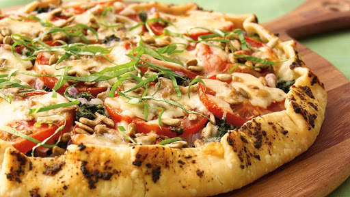 In small bowl, stir together cream cheese and 4 teaspoons of the pesto. Spread cheese mixture over pie crust to within 1 inch of edge. Arrange spinach evenly over cream cheese mixture. Sprinkle onion over spinach. Arrange tomato slices in single layer over onion. Carefully fold 1-inch edge of crust over filling, pleating crust every 2 inches. Brush remaining 1 teaspoon pesto over edge of crust.