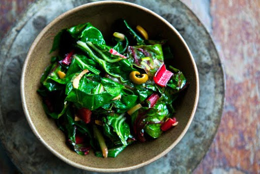 3 Heat a large, stick-free sauté pan on medium high heat. Coat the bottom of the pan with about a tablespoon of olive oil, just enough to coat. When the oil is hot, add the chard stems. Cook for a couple of minutes, stirring often, until they begin to soften. Then stir in the olive mixture. Cook for a minute more, then add the chopped chard leaves to the pan. Use tongs or two large spoons to toss the chard leaves in with the rest of the mixture, so that the chard gets coated with olive oil.