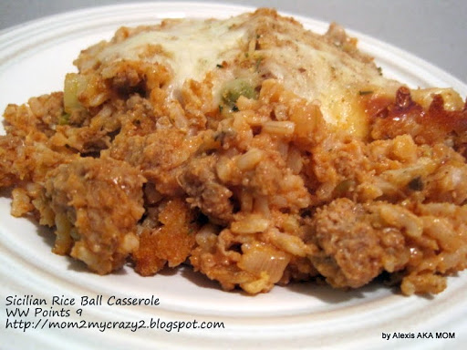 Take half of the rice mixture (a little more if needed) and cover the bottom of the dish and up the sides; press to form the bottom layer. Add the meat and peas