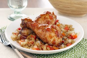 PLACE chicken in single layer in shallow pan. Bake 20 min., turning after 10 min. Meanwhile, mix jam, dressing and mustard until well blended. Reserve 1 Tbsp. jam mixture for mixing with the cooked quinoa.