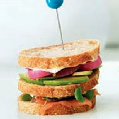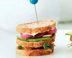 3 For the sandwiches, cut the baguette into twenty-four ½-inch (1-cm) slices. Spread 16 slices with Lemon Mayonnaise. Divide water cress between 8 undressed slices of bread. Top watercress with smoked salmon and cover with a slice of dressed bread, mayonnaise-side down. Place a few pieces of avocado on each sandwich and then top each with a scant tbsp (25 mL) of pickled onions. Finish with final slice of dressed bread, mayonnaise-side down, and cut each sandwich in half if desired. Secure with toothpicks.