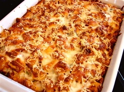 Spread 1 cup of the sauce in 13x9 inch glass baking dish. Top with chicken, overlapping, then remaining sauce.