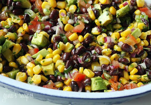 Combine beans, corn, tomato, onion, scallion, cilantro, salt and pepper. Mix with lime juice and olive oil. Marinate in the refrigerator 30 minutes. Add avocado before serving.