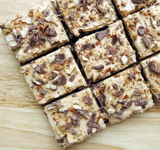 Once the brownies are done cooling, frost them with a thick layer of peanut butter frosting. Cut some chocolate covered peanut butter filled pretzels into small pieces and sprinkle on top of the frosting. I like a lot of pretzel pieces on top.