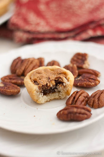 Sprinkle the remaining ½ cup pecans into the tassie shells. Spoon in enough filling into the shells until they are about three-quarters full.