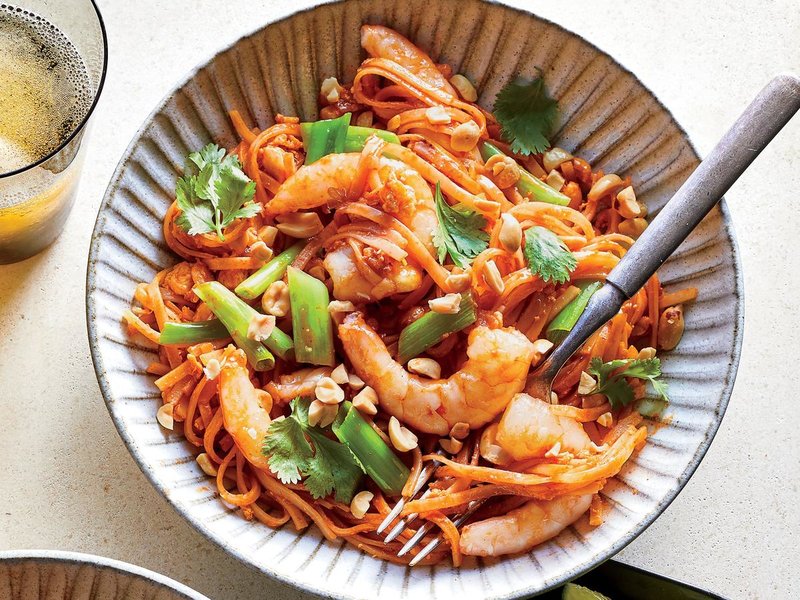 2. Heat oil in a large cast-iron skillet over high. Add scallions and shrimp. Cook, stirring often, until scallions are bright green, 1 to 2 minutes. Add egg; cook, stirring constantly, until egg and shrimp are cooked, about 1 minute. Add noodles, half of the peanuts, ketchup, lime juice, Sriracha, fish sauce, and 1 tablespoon water. Toss well to combine. Serve in shallow bowls; sprinkle with cilantro and remaining peanuts.