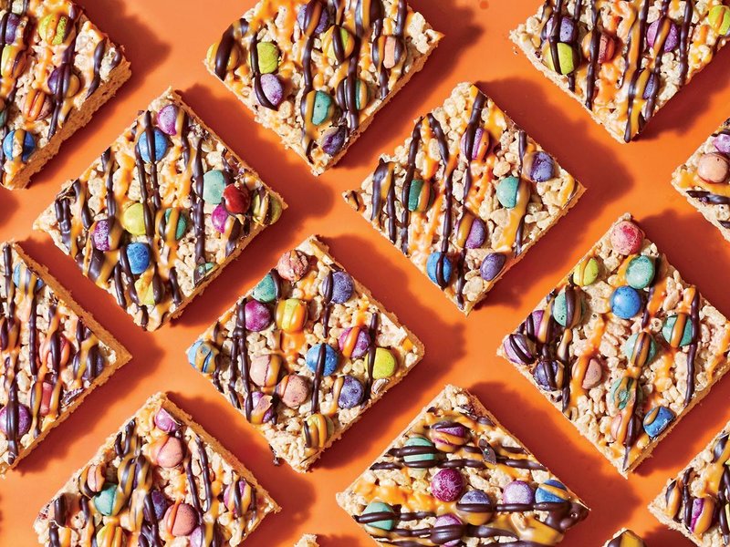 2. Coat a 13- x 9-inch baking dish with cooking spray. Press cereal mixture into baking dish; top with milk chocolate pieces, pressing to adhere.