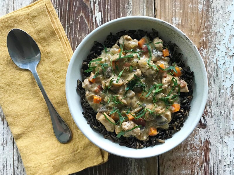 2. Add mushrooms to pot; cook 5 minutes. Transfer to bowl with meat. Add carrot, onion, garlic, and bay leaves to pot; cook until softened. Add vinegar; cook until reduced, 2 minutes. Return chicken mixture to pot. Remove from heat.
