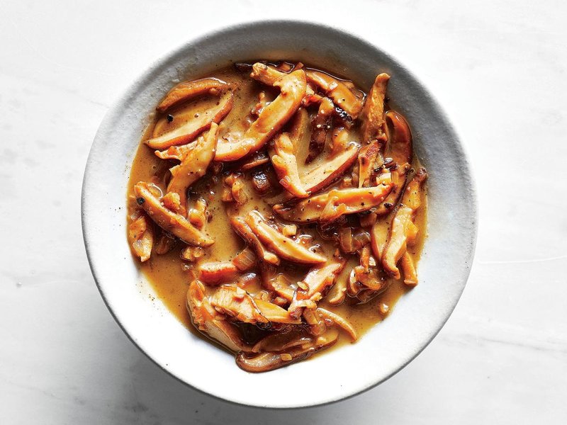 Cook chopped shallots and chopped garlic in a large skillet coated with cooking spray over medium-high until softened, about 2 minutes. Add sliced shiitake mushrooms; cook until browned, 5 minutes. Add unsalted chicken stock, white wine, and balsamic vinegar; bring to a boil. Reduce heat to medium; cook until reduced by half. Stir in unsalted butter, kosher salt, and black pepper.