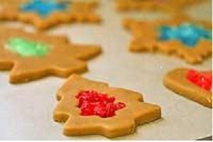5 Place one disk between two large sheets of waxed paper and roll to 1/4" thickness. Use cookie cutters to cut dough into desired shapes. Transfer cookies to prepared baking sheets, ~1" apart. Using a smaller cookie cutter or a knife, cut shapes into centers of cookies, reserving these center bits to add into extra dough.