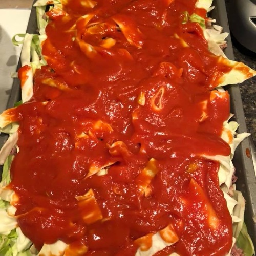 In a 9X9-inch pan, place a layer of the shredded cabbage so that the bottom of the pan is completely covered.