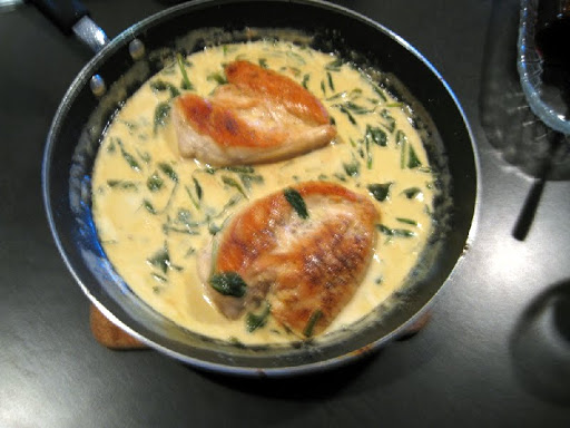 2. Add wine to hot pan and let reduce to one half. Add mushrooms and saute for 4-5 minutes. Add heavy cream and garlic and Parmesan cheese. Mix and bring to simmer. Add spinach and basil and cook until spinach becomes tender.