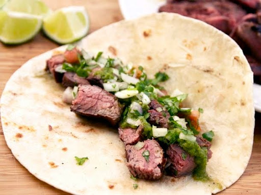 Slice steak thinly across the grain, then cut each slice into 1/2-inch pieces. Serve immediately with warm tortillas, diced onions, chopped cilantro, lemon wedges, and salsa as desired.