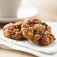 2.Beat in as much of the flour as you can with a mixer; stir in any remaining flour. Using a wooden spoon, stir in raisins, chocolate, pecans, and almonds. Drop by rounded teaspoons 2 inches apart onto an ungreased cookie sheet.