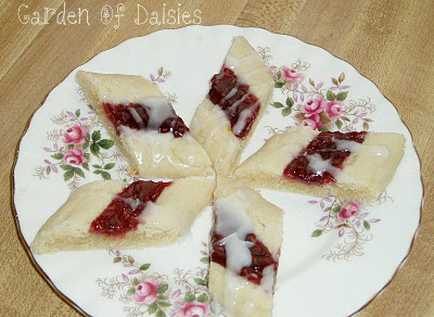 Bake for about 5 minutes more, or till edges begin to slightly brown. Cool on cookie sheet for 5 minutes. Mix up the glaze while you are waiting. Add powdered sugar, almond flavor and 3-4 teaspoons of milk to make a drizzling consistency.