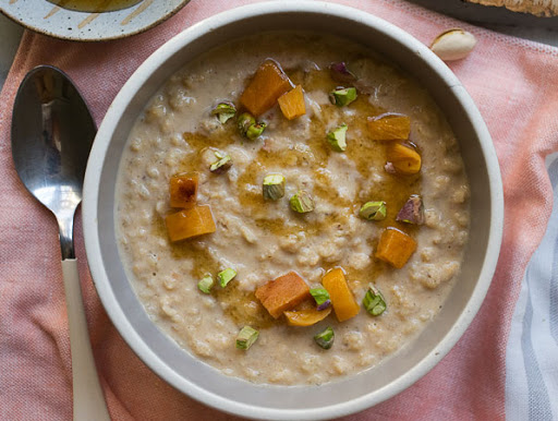 3. Divide the porridge between bowls. Top with the reserved persimmon cubes, a drizzle of honey and a few pistachios.