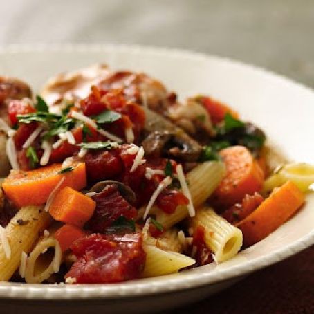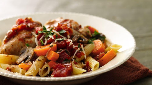 Serve chicken with pasta. Garnish with cheese and parsley.