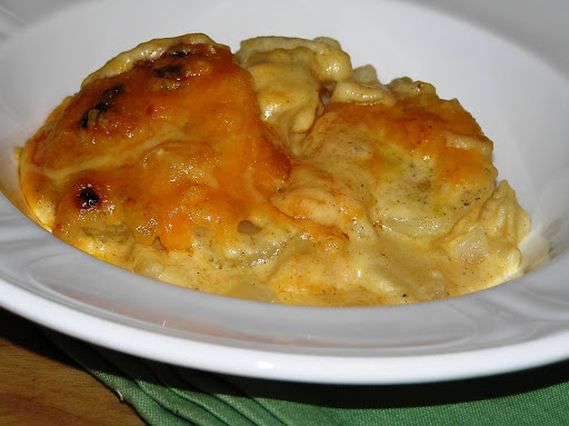 In buttered baking dish, mix potatoes, 3/4 pounds of grated cheese, salt and pepper.