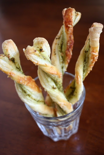 On a floured surface, roll out one sheet of the puff pastry to about 2 inches larger on each side. Cut lengthwise into two rectangles. Spread about 1/3 to 1/2 cup of the pesto onto one half of the puff pastry. You want it to be covered, but don’t use to much or the straws won’t stay together. Put the other half of the puff pastry on top and pat firmly with your hand to make sure they stick together. Cut into 3/4 inch long strips. Pinch the edges of each strip together.
