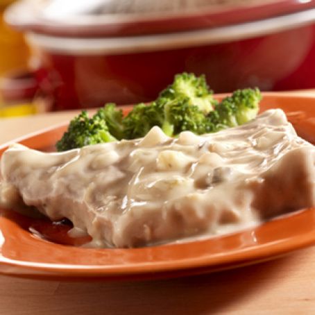 1. Layer the pork and onion in a 3 1/2-quart slow cooker. Stir the soups in a small bowl. Pour the soup mixture over all.