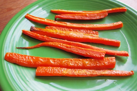 Heat oven to 450 degrees. Line a rimmed baking sheet with parchment paper. Slice carrots into thin strips about 4 inches long and ¼ inch wide.