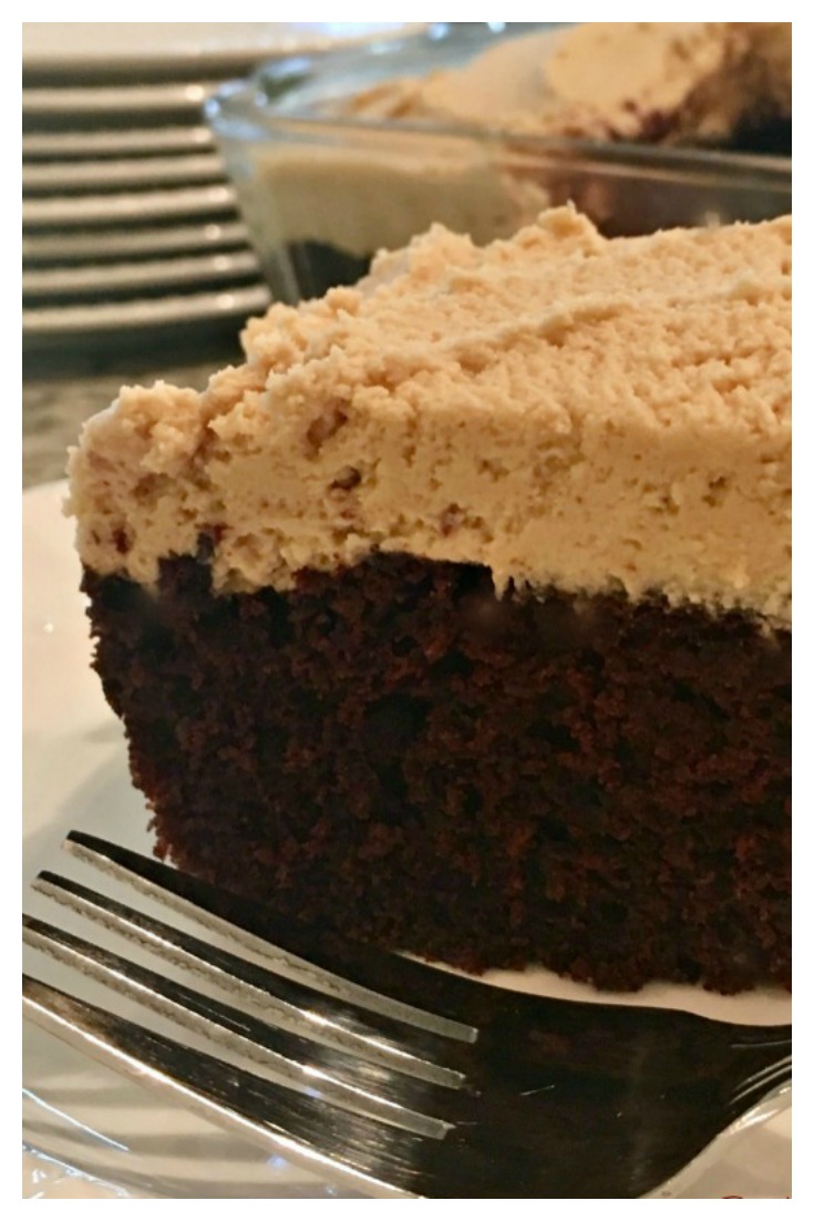 Place butter and peanut butter in a medium to large size bowl, beat using an electric mixer until smooth and creamy. Next add two cups of confectioners’ sugar, beat until blended well and it begins to thicken, then add vanilla (optional) and 1 tablespoon of milk at a time (3 tablespoons total) – mix for approximately 3 minutes, until it’s lighter, fluffy and spreadable. If frosting is too thick, add a little more milk and beat. When ready, frost cake – enjoy!
