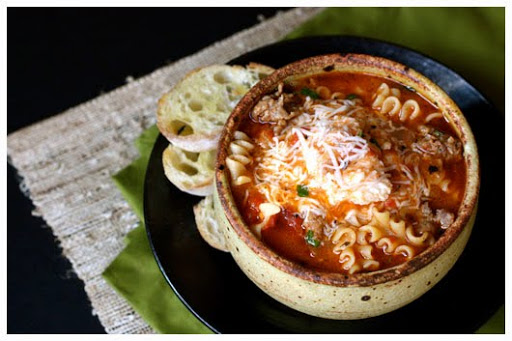 Add diced tomatoes, bay leaves, and chicken stock. Stir to combine. Bring to a boil and then reduce heat and simmer for 30 minutes. Add uncooked pasta and cook until al dente. Do not over cook or let soup simmer for a long period of time at this point, as the pasta will get mushy. Stir in basil and season to taste with salt and freshly ground black pepper.