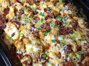 4. Once the potatoes and chicken are fully cooked, remove from the oven. Top the cooked potatoes with the the cheese, bacon, and green onion. Return the casserole to the oven and bake for 5 minutes or until cheese is melted.