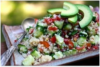 3. Combine the tomatoes, chiles, cilantro, vinegar, lime juice and olive oil in a bowl. Add the cucumber and onion, season to taste with salt, and add the quinoa and cilantro. Toss together, and taste and adjust seasonings. Serve garnished with sliced avocado and cilantro sprigs.