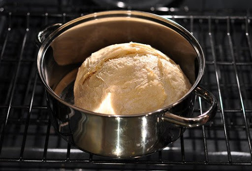 14. About 20 minutes before the hour is up, turn on the oven to 450°F. Place an oven-safe Dutch oven or pot in the oven.