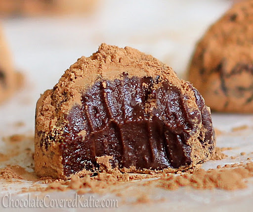 If using the microwave: combine chocolate, milk, and optional salt in a microwave-safe dish, and heat 50 seconds. Stir, then heat until melted, in 10-second intervals (chocolate burns quickly), stirring after each. Now add extract if desired. Freeze at least 40 minutes, or until chocolate is hard enough to scoop out into truffle shapes with a mini cookie scoop. (Alternatively, you can freeze in candy molds.) If using the stove, heat chocolate on low until melted, stirring frequently, then proceed with the recipe as written above. I store my truffles in the freezer until just before serving. Roll in cocoa before serving, if desired.