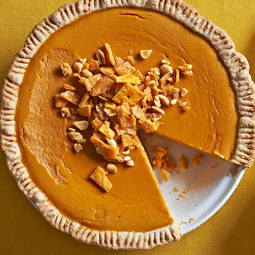Add harvest flavor to pumpkin pie with mashed sweet potatoes. Brown-sugar-coated cheese crackers and peanuts make for an easy yet elegant topper.