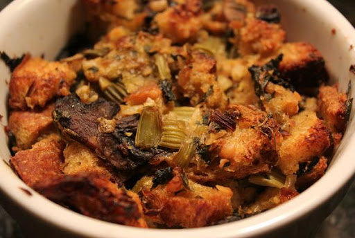 4. Add the bread mixture. Use the remaining butter from greasing to spread over the top of the stuffing. Cover and bake for 30 minutes. Uncover, and bake for another 15 minutes or until top is golden.
