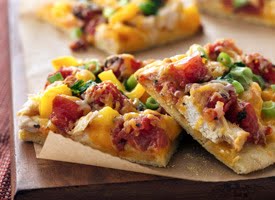 4. Sprinkle with 1 cup of the cheese blend. Top with chicken, tomatoes and bell pepper. Sprinkle with remaining 1 cup cheese. Bake 6 to 8 minutes longer or until cheese is melted and edges are golden brown. Sprinkle with onions and cilantro