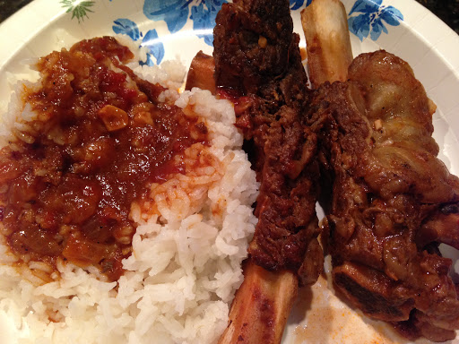 With tongs, set short ribs back into the pot, submerging as much as possible in the sauce. Cover pot and place into the oven. Cook for 3 1/2 to 4 hours. Short ribs should be tender and falling off the bone.