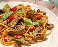 4. Add oil to wok. Stir-fry beef in hot oil for 3 to 4 minutes or until done. Push beef to sides of wok. Stir sauce and pour into the center of wok. Cook and stir until thickened and bubbly. Return vegetables to wok; cook and stir all ingredients 1 minute. Toss with spaghetti. Makes 4 servings.
