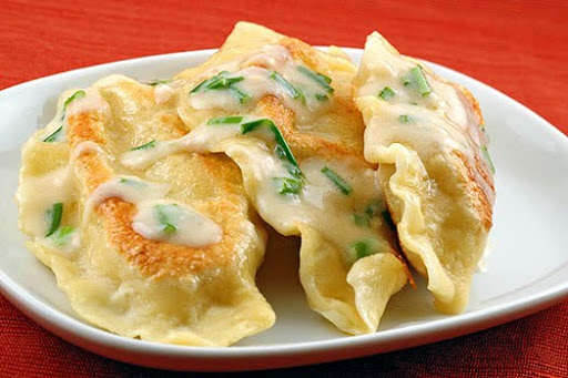 Pierogi homemade with sour cream sauce
