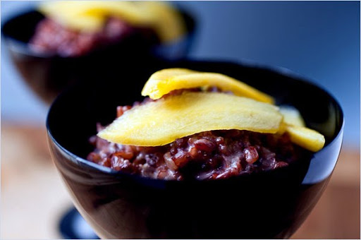 - This dish is inspired by a classic Thai sweet made with sticky rice. The red Bhutanese rice has a very nice chewy texture, and the pudding has a light purple-red hue.