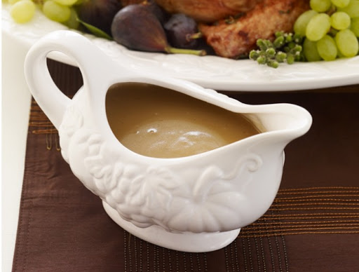 Gather pan drippings: Pour drippings from roasting pan into a glass measuring cup or fat separator. Place in refrigerator to cool and allow fat to rise to the top. Use a ladle to remove fat from top (and discard) or use a turkey baster to suction darker pan drippings from the bottom.