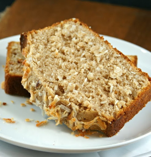 Spray a 9 x 5 or 8 ½ x 4 inch loaf pan with non-stick spray with flour added. Pour batter into the pan. Sprinkle ½ cup of the coconut on top and lightly press. Bake until a knife inserted in the center comes out clean – about 1 hour to 75 minutes. Cool in pan for five minutes and let cool on a wire rack.