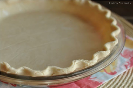 Using your rolling pin (as pictured above) to aid in moving the dough, carefully ease the crust into a 9 inch pie plate. Or use the bottom layer of parchment paper to invert the entire pie crust over the top of the pie plate (say a little prayer) and gently peel off the parchment paper. Press the dough evenly into the bottom and sides of the pie pan (if there are any tears in the crust, simply wet your fingers and try to smooth them out as best as you can).