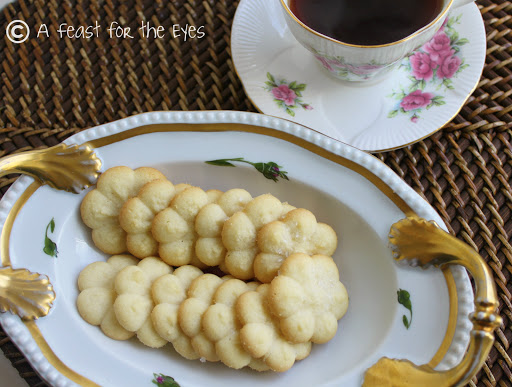 The origins of this cookie is divided between Swedish and German. Either way, "spritz" means "squirt" and that's how the cookies are placed onto a baking sheet. You can use either a "Cookie Press" (typically a cylinder with a trigger that pushes the dough through a variety of disk shapes), or you can pipe them from a pastry bag. Either way, the recipe is very simple but has a lot of possibilities for flavor variations. This recipe comes from America's Test Kitchen, and it's the best one I've made so far. The cookies are crispy on the outside, and tender on this inside. I love them with a hot cup of tea. For the record, I used OXO's new Cookie Press, that works great!
