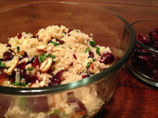 Once cool, combine quinoa, cranberries, scallions, almonds, cilantro and parsley in large bowl.