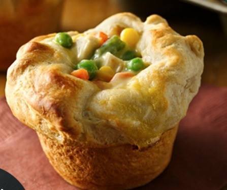 2) Press each biscuit into 5 1/2-inch round. Place 1 round in each of 8 greased regular-size muffin cups. Firmly press in bottom and up side, forming 3/4-inch rim. Spoon a generous 1/3 cup chicken mixture into each. Pull edges of dough over filling toward center; pleat and pinch dough gently to hold in place.